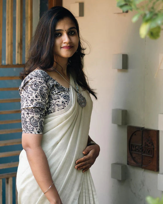 Beautiful Black Cotton Plain Saree with Kalamkari Blouse
