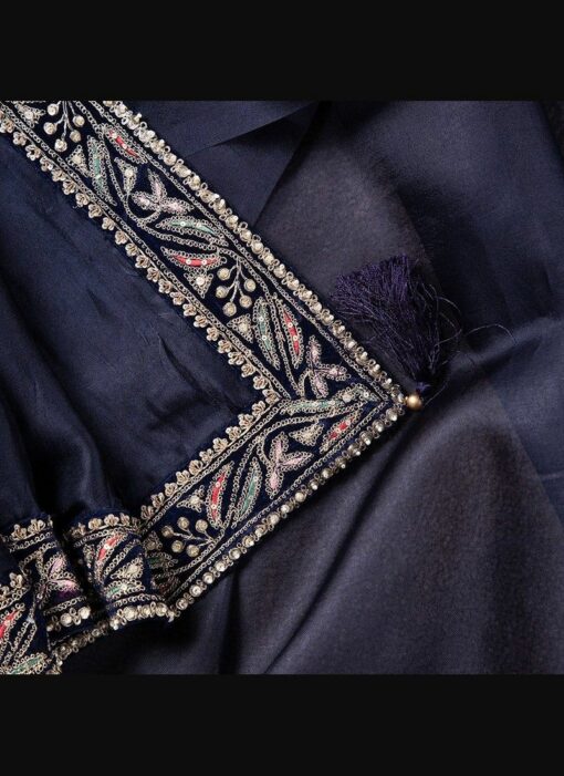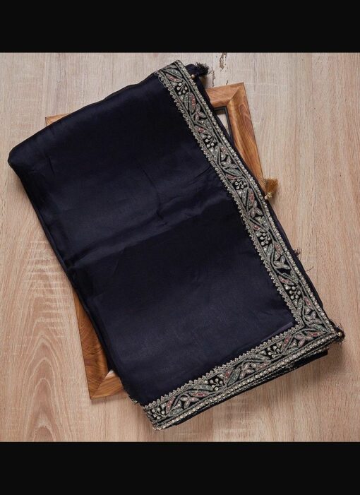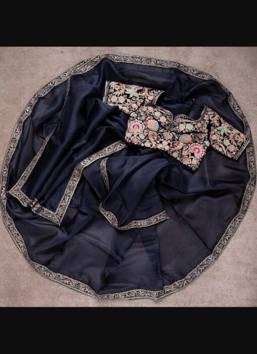 Dark Navy Blue Color With Embroidery Work Lace Border Saree With Blouse