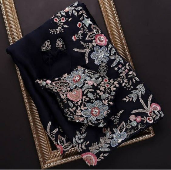 Navy Blue Colour Embroidery And Thread Work Designer Saree With Blouse