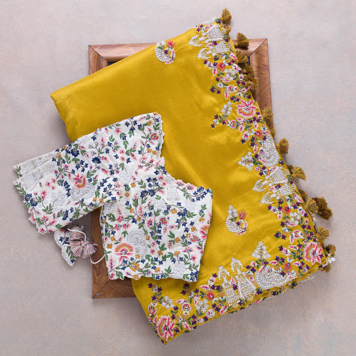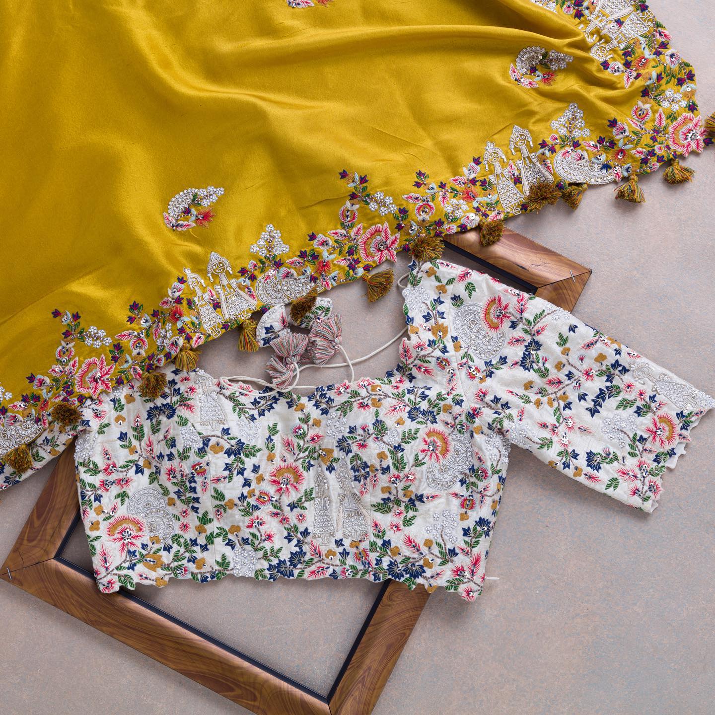Yellow Colour Embroidery And Thread Work Designer Saree With Blouse